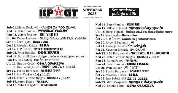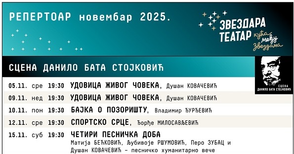 Novembarski repertoar je spreman, a ulaznice će biti u prodaji od utorka, 21. oktobra od 12 časova. Novi komad Zvezdara teatra, Una, Stevana Koprivice, biće na repertoaru u tri termina, 17, 19. i 25. novembra uz napomenu da predstava nije prikladna za decu mlađu od 16 godina.