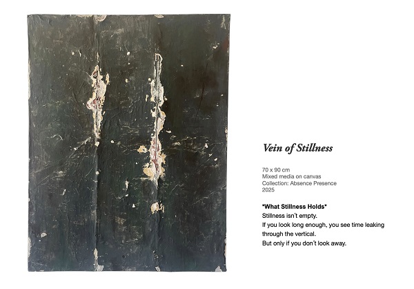 Njeni radovi nisu dekorativni. Oni su svedoci. Zidovi koji pamte. Površine koje dišu kroz pukotine, ogoljenost i materijalnu težinu. U slikanju koristi cement, konopce, papir, skalpel – sve što nosi osećaj prolaznosti i unutrašnje istine. Serije Absence Presence, Vestiges of Time i Ashes of Presence bave se onim što ostaje nakon što trenutak prođe. U Silosima slike postaju jedno sa zidovima. Ne objašnjavaju, već podsećaju na prolaznost i pozivaju da budemo potpuno prisutni, svakog trenutka.