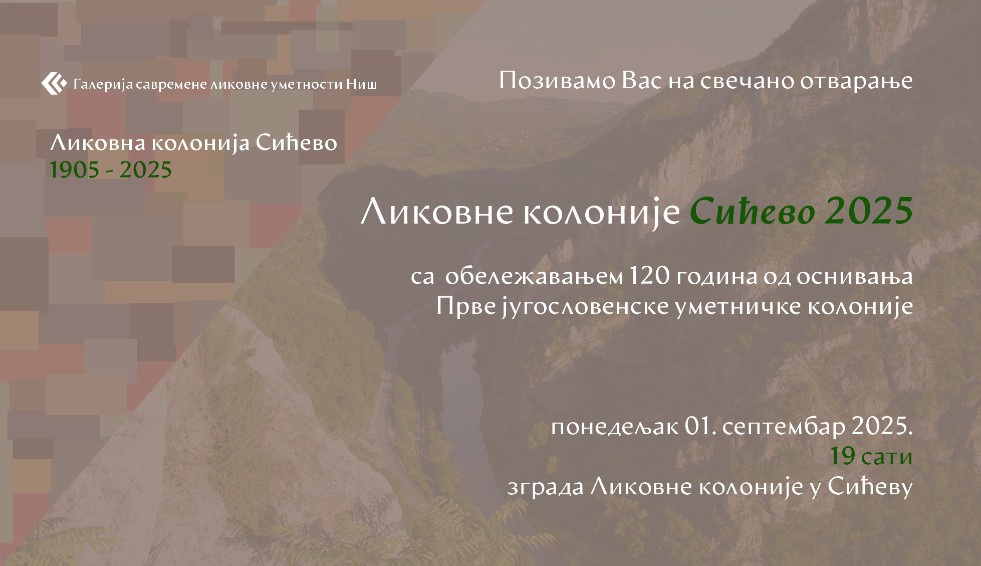 Galerija savremene likovne umetnosti Niš poziva na svečano otvaranje Likovne kolonije Sićevo 2025 u ponedeljak 1. septembra u 19 sati, objekat kolonije u selu Sićevo.