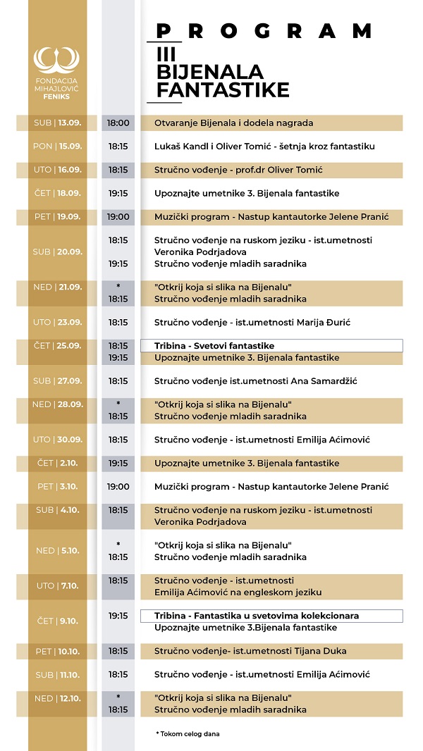 Treće izdanje Bijenala Fantastike, održaće se od 13. septembra do 12. oktobra 2025. godine u renoviranom i proširenom prostoru Likovne galerije Kolarčeve zadužbine. Ova jedinstvena manifestacija okuplja umetnike, teoretičare i ljubitelje fantastične umetnosti iz zemlje i inostranstva, kroz raznovrstan program koji kombinuje izložbe, stručna vođenja, tribine i muzičke nastupe, tradicionalno u organizaciji i produkciji Fondacije Mihajlović-Feniks.