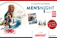 Men`s night događaj u bioskopima Cineplexx UŠĆE Shopping Center, Delta City, Kragujevac Plaza i Cineplexx Niš, uz prikazivanje filma „XXX – Povratak Zendera Kejdža“, održaće se u četvrtak, 26. januara, sa početkom u 20 časova. Sve pripadnike jačeg pola koji odluče da uspavano januarsko veče zamene beskompromisnom akcijom i uživanjem u filmu u okviru Men`s night događaja, uz kupljenu ulaznicu očekuje poklon primerak Autobild magazina i osveženje u vidu Grant’s viskija.