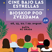 Već nekoliko godina za redom, u saradnji sa KC Grad, Institut Servantes prikazuje odabrane filmske naslove u bašti KC GRAD, sa titlovima na srpskom jeziku. Ulaz je slobodan. Svakog utorka u mesecu od 21 čas. Program za avgust: 08.08 od 21:00 h – Plavo, ne baš roze (2012), Miguel Ferrari // 15.08 od 21:00 h – Srećnih 140 (2014), Gracia Querejeta // 22.08 od 21:00 h – Nerazdvojni (2016), Marcos Carnevale // 29.08 od 21:00 h – Vanzemaljac (2011), Nacho Vigalondo.