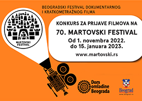 Odbor Festivala i Dom omladine Beograda obaveštavaju sve domaće produkcije i autore da je od 1. novembra 2022. do 15. januara 2023. godine rok za podnošenje prijava za selekciju domaćeg takmičarskog programa (dokumentarnog do 50 minuta, dokumentarnog preko 50 minuta, kratkog igranog, animiranog, eksperimentalnog filma i video arta) 70. BEOGRADSKOG FESTIVALA DOKUMENTARNOG I KRATKOMETRAŽNOG FILMA – MARTOVSKOG FESTIVALA. Konkurs je otvoren i za autore i produkcije iz inostranstva, isključivo za prijavu kratkometražnih filmova i to u sledećim kategorijama: igrani, dokumentarni, animirani, eksperimentalni film i video art. Prilikom prijavljivanja međunarodnih filmova plaća se naknada (submission fee) u iznosu od $20.
