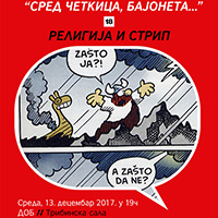 U sredu, 13. decembra 2017. u 19:00 u Tribinskoj sali Doma omladine Beograda, održaće se Ciklus okruglih stolova o zabranjenim temama srpskog i jugoslovenskog stripa "SRED ČETKICA, BAJONETA..." Za mnoga likovna ostvarenja sa religioznom tematikom koja su, u najmanju ruku vekovima, oblikovana u sekvencama prizora (freske, ikone, iluminacije...), slobodno se može konstatovati kako su svojevrsni prastripovi. No, ovakvo tradicionalno prisutno baratanje vizuelnom naracijom, u odnosu sveštenstva i crkvenih institucija prema vernicima ipak nije bilo, a ni danas još uvek nije podjednako prihvaćeno od strane svih konfesija. Neke su u ovom pogledu i otvorenije i preduzimljivije.