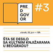 U utorak 13. Juna, 19h - Sećate li se knjižare „Plato“? Da li primećujete knjižaru „Geca Kon“ pored koje gotovo svakodnevno prolazite u centru Beograda? Šta se desilo sa „Stubovima Kulture“? U trećem po redu razgovoru u okviru književnog ciklusa „Predgovor“ razgovaramo na temu kultnih knjižara u Beogradu. Zajedno sa našim sagovornicima pokušaćemo da saznamo gde su nestale, koji status su ranije uživale i šta je uopšte značio „kultni“ status ovakvih institucija kulture ranije, a šta danas. U doba neoliberalnih kulturnih politka i masovne konzumacije, suočeni smo sa odumiranjem knjižara koje bivaju zamenjene velikim prodajnim lancima.
