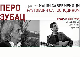 U sredu 2. juna od 19.00 časova velika sala SKC, održaće se poetsko-muzičko veče PERO ZUBAC: RAZGOVORI SA GOSPODINOM, u okviru ciklusa: Naši savremenici; učestvuju: Miloš Zubac i Pero Zubac. „Stvoriti Nešto, a da Ono nosi Xarmoniju! Sa kakvom neizdržljivom lakoćom to Zupcu polazi za perom! To je, kako on kaže, val koji donosi mir. Čitajući ga, čovek ima utisak da je u njemu stalno u opasnosti da otpadne u neke svoje bezdane jedan sakriveni deo nematerije, da ga Pero čvrsto uz sebe priljubljuje i ne dozvoljava mu samostalnost jer, bez tog dela, on je samo Pesnik, ranjiv i porozan.
