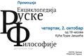 Prva promocija Enciklopedije Ruske Filosofije, dopunjeno izdanje, (izdavači Logos Bgd, Grafičar Gorjani 2014. godine) u okviru koje će govoriti profesori filosofije iz Moskve Mihail Maslin, Petar Kalitin i Petar Apriško, uz urednika Vladimira Medenicu i prevoditeljku Ljudmilu Joksimović, održaće se u četvrtak, 02. oktobra od 19 časova u Kući Đure Jakšića.