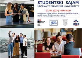 U sezoni sajmova i upisnih procedura francuskih visokoobrazovnih ustanova održava se 14. „Putujući studentski sajam: upoznajte francuske univerzitete“ u petak, 27. oktobra 2023. od 10 do 18 časova na Sajmu knjiga na Beogradskom sajmu, hala 2A, štand Confluences Francuskog instituta u Srbiji. Ovaj datum je i početak kampanje za dodelu stipendija Vlade Republike Francuske za Master 2 i doktorate u ko-mentorstvu za akademsku 2024/2025. Ove godine Francuska je počasni gost Sajma knjiga u Beogradu i cela ova jesen je u bojama Francuske. Sektor za univerzitetsku i naučnu saradnju Francuskog instituta u Srbiji tim povodom pripremio je bogat program.