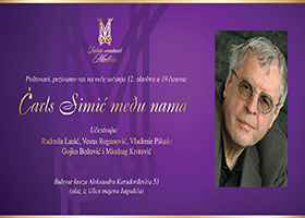 Veče sećanja na Čarlsa Simića, američkog pesnika srpskog porekla, biće održano u Palati umetnosti Madlena 12. oktobra, sa početkom u 19 časova. Rođen kao Dušan Simić 1938. godine u Beogradu, nakon što se 1953. godine sa porodicom preselio u Ameriku menja ime u Čarls Simić i pišući na engleskom jeziku postaje jedan od najvećih američkih pesnika dvadesetog veka. Prva knjiga objavljena mu je u Americi već 1966. godine, a za njom su usledile i druge, ne samo pesničke već i prozne i esejističke knjige. Kritičari su ga proglašavali ontološkim pesnikom, novim metafizičarem i mistikom svakodnevice.