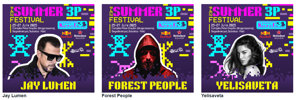 Muzički noćni program obeležiće Jay Lumen, mađarski tehno vizionar i jedan od najtraženijih izvođača istočnoevropske elektronske scene, koji hipnotiše plesni podijum uz svoj dobro poznati pulsirajući groove. Svoj set zavrteće i Forest People, DJ iz Bosne i Hercegovine, čija izdanja su podržali velikani poput Richie Hawtina i Technasie. Subotičkoj publici, predstaviće se sve zapaženija mlada beogradska umetnica Yelisaveta, koja spaja emotivni techno sa sirovim i spiritualnim tonovima a novosađanin Synsane, doneće na stejdž snažnu, preciznu i eksperimentalnu techno estetiku koja plesni podijum uvlači u dubine rejva, dok će mladi izvođač Boatech iz Mađarske predstaviti eksploziju elektronskog zvuka na 23. izdanju Summer3p festivala. Lokalnu podršku pružiće im subotički izvođači: Radical Axis, Wikinger i Veridical.