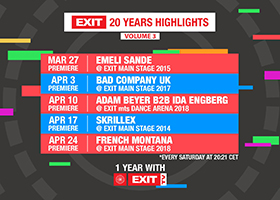 Pre tačno godinu dana, emitovanjem do tad neobjavljenog, legendarnog nastupa grupe Faithless na glavnoj bini festivala 19. marta 2020. godine, lansiran je specijalan Exitov onlajn program “EXIT TV”, čiji cilj je bio da uz snimke brojnih nastupa sa Tvrđave, olakša svima, a posebno mladima, ostanak kod kuće tokom vanrednog stanja. Retko ko bi tada rekao da će godinu dana kasnije i dalje postojati potreba za podrškom mentalnom zdravlju mladih, koje je ozbiljno narušeno usled više od godinu dana odsustva druženja na koncertima i festivalima, koji mnogima predstavljaju sastavni deo identiteta. U tom cilju, a u susret velikoj proslavi 20 godina festivala koja će se održati na Petrovaradinskoj tvrđavi od 8-11. jula, EXIT lansira novu seriju premijernih emitovanja festivalskih nastupa koji su obeležili istoriju jednog od vodećih svetskih festivala.