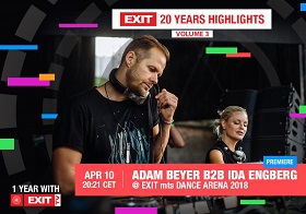 U subotu, 10. aprila, tačno u 20:21h, EXIT TV premijerno donosi jedan od nastupa koji je obeležio istoriju festivala – back 2 back set najpoznatijeg bračnog para u elektronskoj muzici, Adama Bejera i Ide Engberg, iz 2018. godine. U susret velikoj proslavi 20 godina festivala, EXIT je nedavno lansirao seriju premijernih emitovanja festivalskih nastupa koji su zauvek ostali urezani u sećanje posetilaca. Za sve fanove tehna nema boljeg podsećanja na muzičko umeće od onog kojeg je ovaj par pokazao pred punom mts Dance Arenom 12. jula 2018.