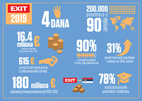 U dosad najboljoj godini za EXIT, zahvaljujući nekoliko ključnih parametara kao što su maksimalna poseta, ali i čak 31% više inostranih posetilaca nego prošle godine, ostvaren je i rekordan doprinos našeg najvećeg festivala domaćoj privredi. Opsežno istraživanje koje "TIM centar" iz Novog Sada sprovodi svake godine za vreme festivala, ove je godine pokazalo da je EXIT doneo novih 16,4 miliona evra turističkoj privredi Novog Sada i cele Srbije! Tako je od osnivanja festivala do danas, domaća privreda ostvarila preko 180 miliona evra ekonomske koristi od Exita, i to ne računajući višestruko veću procenjenu vrednost međunarodne promocije Novog Sada i cele Srbije!
