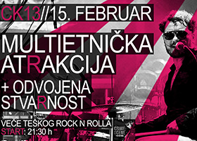 Subota // 15. FEBRUAR // CK13, Novi Sad - Crime:Scene predstavlja fantastični teški rock 'n' roll spektakl - koncert MULTIETNIČKE ATRAKCIJE! Kao što znate, Multietnička Atrakcija je bar jednom godišnje gost Novog Sada a ovaj put dolaze u CK13 u posve novoj postavi, tako da će biti zanimljivo pogledati ih i čuti u novom ruhu. Dobro znana cirkuska teška rock'n'roll ekipa predvođena harizmatičnim Osmanom će, pored svog ustaljenog žestokog rokenrola, premijerno predstaviti i potpuno nove pesme koje spremaju za novo izdanje. Ove godine bend obeležava punih 11 godina postojanja pa će tom prilikom izvesti i lep presek svoje karijere.