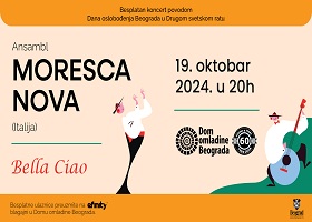 Dom omladine Beograda, povodom obeležavanja Dana oslobođenja Beograda u Drugom svetskom ratu, poklanja publici besplatan koncert italijanskog ansambla MORESCA NOVA u subotu 19. oktobra u 20 časova u Velikoj sali DOB-a. Ova izvanredna muzička grupa, na večeri pod nazivom „Bella Ciao”, izvešće repertoar tradicionalne italijanske muzike, kao i slobodarskih pesama koje su obeležile duh antifašističkog pokreta širom sveta. Besplatne ulaznice mogu se preuzeti na eFinity blagajni u DOB-u. Jedna osoba može preuzeti do 4 besplatne ulaznice.
