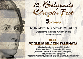 Koncertno veče mladih talenata u okviru Beogradskog Šopen festa održaće se 5. oktobra u Ustanovi kulture Gvarnerijus. Na prvom koncertu Podijum mladih talenata koji počinje u 18.30 časova, predstaviće se nagrađivani učenici muzičkih škola iz Sremske Mitrovice i Beograda, i Fakulteta muzičke umetnosti. Zatim, od 20.00 časova sledi koncert Zvezde u usponu na kome ćemo slušati resital pijaniste Kristijana Vučkovića. Ulaz za oba koncerta je slobodan, uz prethodnu rezervaciju mesta putem mejla Ova adresa el. pošte je zaštićena od spambotova. Omogućite JavaScript da biste je videli. ili telefonom na broj 066 8028 368. Podijum mladih talenata je koncertni ciklus u okviru koga Beogradski Šopen fest predstavlja mlade pijanističke talente iz Srbije i regiona.