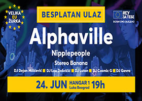 23. jun, 2013. - Veliku EU žurku, 24. juna od 19h u Hangaru, Luka Beograd, organizuje Delegacija Evropske unije kao poklon građanima Srbije, tako da su svi koncerti besplatni. Program počinje u 19h nastupom DJ Gavre koji će publiku zagrejati muzikom 80-ih godina, a u 21h na scenu stupa headliner Velike EU žurke, legendarni nemački bend Alphaville, koji će po prvi put održati koncert u Srbiji. Hangarom će se zaoriti bezvremenski svetski hitovi „Forever Young", „Big in Japan", „Sounds Like a Melody" i druge pesme iz bogate karijere ovog elektro-pop benda koji traje već 40 godina.