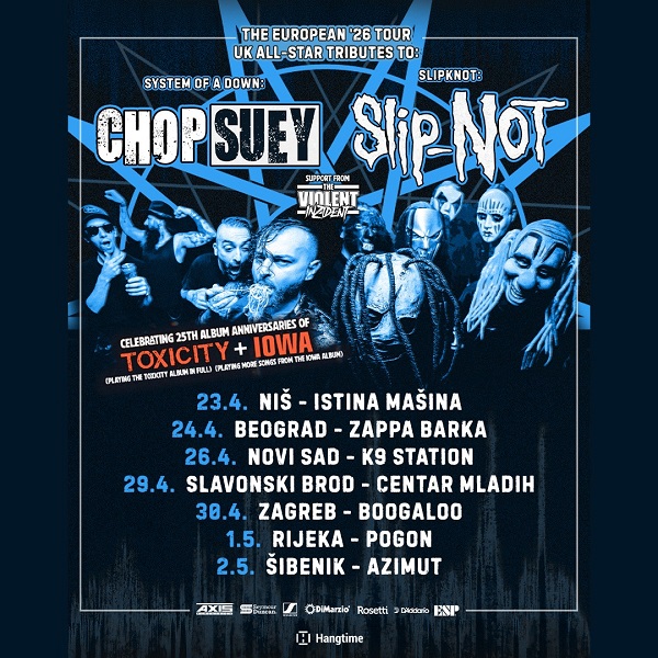 Nakon fenomenalnog Forever NU festivala, koji je ozbiljno podigao lestvicu tribute scene, Chop Suey i Slip-NOT vraćaju se u Srbiju kako bi još jednom priredili žurke za pamćenje. Teško da može biti drugačije kada se na jednom mestu okupi toliko vrhunskih muzičara sa bukvalno hiljadama odsviranih koncerata. Na ovoj regionalnoj turneji pridružuju im se i nu-metal majstori parodije, The Violent Inzident, koji će se premijerno predstaviti domaćoj publici. Koncerti će se održati 23.4. u niškoj Istini Mašini, 24.4. u beogradskoj Zappa Barci te 26.4. u novosadskom K9 Stationu. Poseban povod je 25 godina kultnih albuma „Toxicity“ i „Iowa“. Očekujte neviđeni spektakl posvećen klasicima koji su obeležili čitavu jednu generaciju. Ulaznice se po pretprodajnoj ceni mogu nabaviti putem Gigstix-a i na fizičkim prodajnim mestima u svakom od gradova.