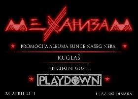 Užički bend Mehanizam održaće koncertnu promociju svog debi albuma „Sunce našeg neba“ u petak, 28. aprila u beogradskom klubu Kuglaš. Kao specijalni gosti nastupiće Playdown. Mehanizam je bend iz Užica nastao u maju 2019. godine. Stvaraju muziku koja svoje korene pronalazi u počecima težeg roka kroz prizmu ličnih ideja i različitih muzičkih uticaja. Članovi benda su Ignjat Milićević (klavijatura, vokal), Miloš Milićević (gitara), Matija Tasić (bas gitara) i Srđan Tomić (bubnjevi).