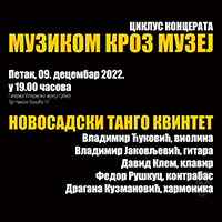 Istorijski muzej Srbije i udruženje „UNICA ART” imaju zadovoljstvo da Vas pozovu da u petak 9. decembra u 19 časova prisustvujete koncertu kamernog ansambla „Novosadski tango kvintet”, šestom koncertu u okviru treće sezone ciklusa „Muzikom kroz muzej”. Koncert se održava pod pokroviteljstvom Ministarstva kulture Republike Srbije i Sekretarijata za kulturu grada Beograda. Kamerni ansambl „Novosadski tango kvintet”, čine Vladimir Ćuković, violina, Vladimir Jakovljević, gitara, David Klem, klavir, Fedor Ruškuc, kontrabas, i Dragana Kuzmanović, harmonika. Na programu su kompozicije slavnog argentinskog kompozitora Astora Pjacole, zaslužnog za svetsku popularizaciju tanga.