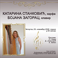 Dobitnica prve i specijalne nagrade na međunarodnom takmičenju „Karel Patras“ u Pragu, studentkinja doktorskih studija Fakulteta muzičke umetnosti, harfistkinja Katarina Stanković održaće solistički koncert u četvrtak, 03. novembra 2022. godine (20č) u Ustanovi kulture Gvarnerijus. Uz klavirsku saradnju Bojane Zagorac izvešće dela Glijera, Jovanovića i Zabela. Ulaz na koncert je slobodan a mesta se mogu rezervisati putem mejla Ova adresa el. pošte je zaštićena od spambotova. Omogućite JavaScript da biste je videli. ili telefonom 066/8028-368. Ovaj koncert deo je jedanaeste sezone ciklusa "FMU i Gvarnerijus nagrađuju", koji promoviše najbolje studente Fakulteta muzičke umetnosti u Beogradu i realizuje se uz podršku Ministarstva kulture i informisanja.