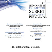 Crkva Uznesenja Blažene Djevice Marije Zemun, Veliki trg 4, za 16. oktobar 2022 u 18 sati, XI ekumenski susret horova crkvenog pevanja - Susret horova crkvenog pevanja koji će se XI put održati u župnoj crkvi uznesenja Blažene Djevice Marije na nebo u Zemunu, a pod pokroviteljstvom vlade Republike Srbije, Ministrastva pravde, Uprave za saradnju s crkvama i verskim zajednicama i bolnice BELMEDIC. Poštujući i ceneći sve različitosti koje pojedini narodi nose kao svoju vrednost nastojimo kroz ekumenske susrete svojom pesmom pokazati svu lepotu različitosti.