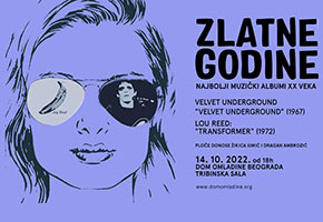U petak, 14. oktobar 2022. u 18:00 // Dom omladine Beograda, Tribinska sala predavanje i preslušavanje ploča, Velvet Underground – “Velvet Underground” (1967), Lou Reed – “Transformer” (1972). Ploče donose: Žikica Simić i Dragan Ambrozić. Predstavljamo neke od najvažnijih stranica i najboljih albuma popularne muzičke istorije! Ovoga put se, krajnje privatno, bavimo pločama koje vole Žikica Simić i Dragan Ambrozić! Osamdeset je godina od rođenja Lou Reeda, te predstavljamo: Lou Reed specijal!