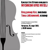 Istorijski muzej Srbije i udruženje „UNICA ART” imaju zadovoljstvo da Vas pozovu da u četvrtak 25. marta u 19 časova prisustvujete osmom u nizu besplatnih onlajn koncerata klasične i popularne muzike u okviru ciklusa „Muzikom kroz muzej”, čiju realizaciju je pomogla „Banca Intesa”. Koncert violiniste Vladimira Koha i pijanistkinje Tanje Jablanović zainteresovani građani će biti u prilici da prate na ju-tjub kanalu i fejsbuk strani Istorijskog muzeja Srbije. Koncert se održava pod pokroviteljstvom Ministarstva kulture i informisanja Republike Srbije.