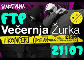 Jedan od najpopularnijih rep kolektiva na domaćoj sceni, FTP ove subote 21. jula s početkom od 23h u KPTM pravi oproštajnu žurku povodom Bogdanovog odlaska iz zemlje na neko vreme. FTP i dalje živi, kreativno burgija i sprema se da pređe neke nove nivoe, a ovim koncertom će se samo na kratko oprostiti od svoje publike bar u ovom sastavu na koji smo do sada navikli. Šta da očekujete? Najveće hitove neprevaziđenog novobeogradskog rep dvojca na velikom open air koncertu u kptm bašti i žurku koja će bez stajanja trajati do jutra.