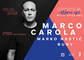 Globalni techno ambasador i jedan od ljubimaca domaće publike, Marco Carola, nastupiće u subotu 22. decembra u velikom Hangaru u Luci Beograd, skoro deceniju posle njegove prethodne posete glavnom gradu Srbije. Na ovom dugo očekivanom događaju, pridružiće mu se legenda domaće elektronske scene Marko Nastić, dok će teren pripremiti mladi multitalenat Stefan Rončević – Runy. Marco Carola jedna je od glavnih figura zaslužnih za razvoj elektronske scene ranih devedesetih godina prošlog veka, čije interesovanje je privukao u to vreme novi muzički pokret u usponu – techno.