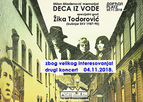 Zbog velikog interesovanja tradicionalni beogradski koncert i multimedijalna manifestacija povodom obeležavanja godišnjice smrti Milana Mladenovića, Deca iz vode / EKV tribute band project / sa gostima pored najavljenog 3. održaće se i u nedelju 4. novembra u Dorćol Platzu. Specijalni gost na oba koncerta biće Srđan Žika Todorović, naš poznati glumac i bubnjar EKV-a od 1987-1990 i on će prvi put posle više od dve decenije odsvirati nekoliko pesama koje je snimio sa EKV-om na dva studijska albuma “Ljubav” i “Par godina za nas” ! Pesme Zemlja, Krug, Srce, Ljubav, Par godina za nas, Pored mene, Ljubav, 7 dana, Sihro su dominirale top listama i taj period se smatra najuspešnijim periodom u radu Ekatarine Velike.