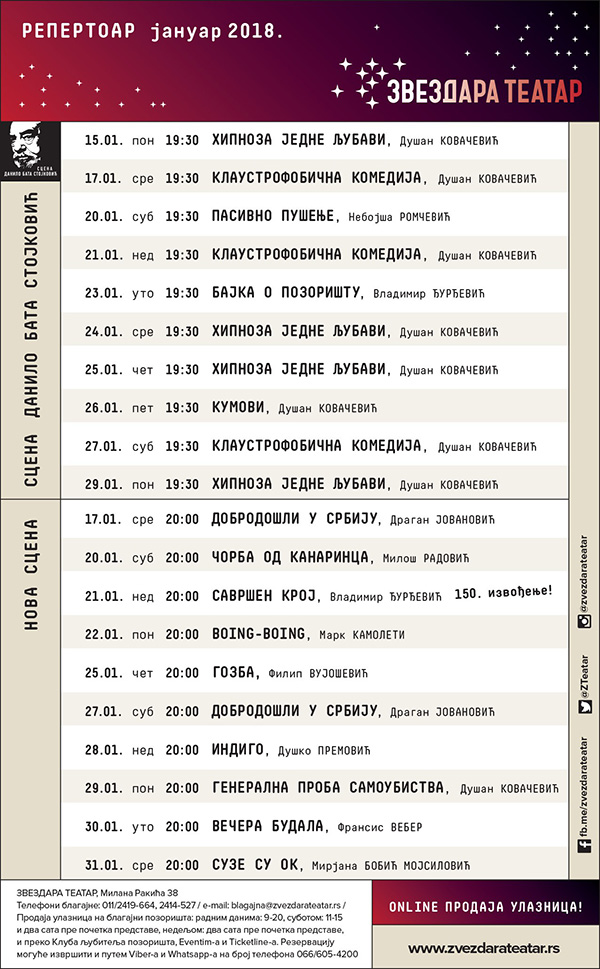 Molimo vas da dođete na vreme, nakon početka predstave ulazak u salu nije moguć. Kašnjenje smeta glumcima i ostaloj publici. Magija počinje kada se ugase svetla, ne propustite je.