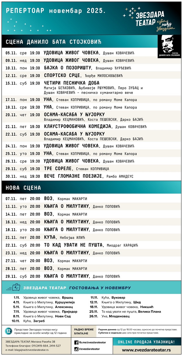 Na sceni Danilo Bata Stojković će četiri puta biti izveden komad Udovica živog čoveka, Dušana Kovačevića – 5, 9, 24. i 26. novembra. Predstava Osama-Kasaba u Njujorku je planirana za 20. i 22. novembar.