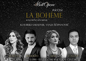 U petak, 29. aprila u 19.00 u Velikoj sali Studentskog kulturnog centra, odigraće se opera Đ. Pučinija: BOEMI. Opera „Boemi“, napisana je u četiri čina i predstavlja jednu od najizvođenijih i najuspelijih radova Đakoma Pučinija. Libreto za operu napisali su Luiđi Ilika i Đuzepe Đakoza, prema Miržeovom romanu „Slike iz života boema“. Edicijom „Opera mozaik“ udruženje mladih operskih umetnika i studenata „Bell'Opera“ predstavlja najpoznatija operska dela u adaptiranoj, skraćenoj verziji - bez pauze i u trajanju jedne pozorišne predstave, prikazujući suštinu i radnju opere, kroz najpoznatije arije, duete i ansamble opere.