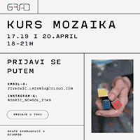 Da li želite da savladate jednu od najstarijih slikarskih tehnika koja u sebi nosi umeća koja nisu samo likovna već i korisna u svakodnevnom životu? Poneti sa sobom rad koji retko ko može izvesti bez pravih mentora koji bi podelili svoje znanje i zanat sa vama? Radom na mozaiku se vežba duboka koncentracija, razmišljanje o formi, bojama i kompoziciji. Mora se paziti na svaki korak i pristup tehnici što zahteva i unapređuje mnogo životno potrebnih veština. Radionica mozaika je retko vredna investicija u jedno bogato iskustvo gde vas čeka kvalitetno druženje kao i kreativni izazovi. Očekujte uživanje, novo znanje i veštine.