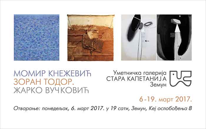 Izložba Momira Kneževića, Zorana Todora i Žarka Vučkovića, akademskih umetnika, biće otvorena u ponedeljak, 6. marta 2017. godine, u 19 časova, u Umetničkoj galeriji "Stara kapetanija". Izložba će biti otvorena do 19. marta 2017. godine. Ulaz slobodan.