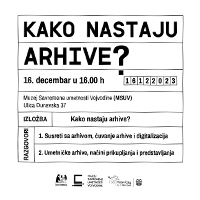 Sa velikim zadovoljstvom vas pozivamo da ispratite aktivnosti projekta "Kako nastaju arhive?", koji će biti prikazan u Muzeju savremene umetnosti Vojvodine - MSUV  (Dunavska 37, Novi Sad), od 16. do 24. decembra 2023. godine. Projekat „Kako nastaju arhive?“ je pokušaj Multimedijalnog centra Led Art da kroz izložbene aktivnosti i razgovore istraži i problematizuje teme sakupljanja, formiranja i pohranjivanja umetničkih arhiva. Projekat je usmeren kako na umetnike, umetničke grupe i organizacije koji su formirali svoje arhive, tako i na mlađe umetnike/ce koji tek započinju svoj umetničku praksu, kao i na stručnu publiku, specifično na kustose/kinje i istoričare/ke umetnosti koji se bave arhivskom građom.