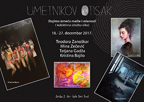 Umetnikov otisak prestavlja koektivnu izložbu slika pod nazivom: "Stojimo između mašte i realnosti" Teodore Zanokšar, Mine Zečević, Tatjane Gadže i Kristine Bajilo. Otvaranje izložbe je zakazano za ponedeljak 18. decembar u 19h. u Art kafe galeriji Beti Ford, Zetska 2, Beograd. "Unutrašnji svet ne treba sputavati, već negovati. Radii na sebi, kako bismo mogli da pružimo drugima. Osnovno pitanje koje pokreće naš projekat glasi: Gde nestaje mašta i počinje realnost i da li su one, zapravo, toliko razdvojene?